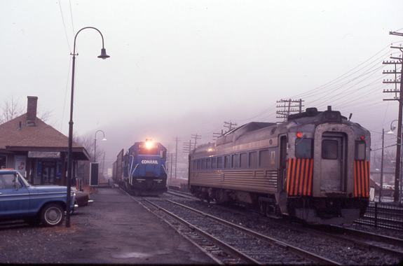 An SF-27 local meets a Metro North RDC at Suffern, NY